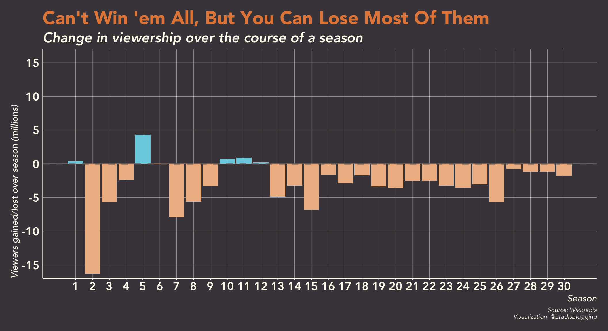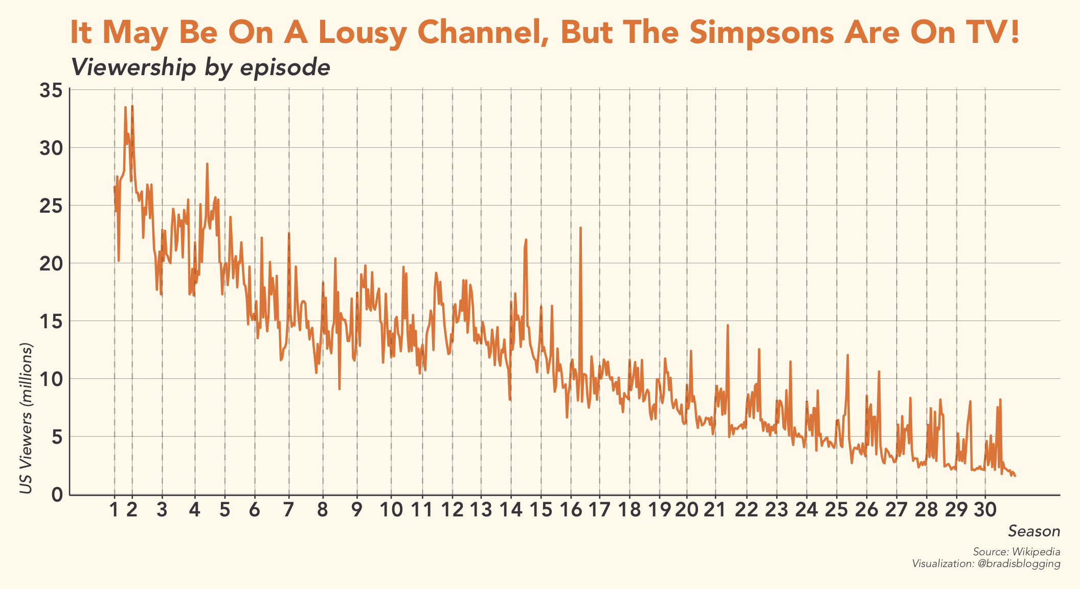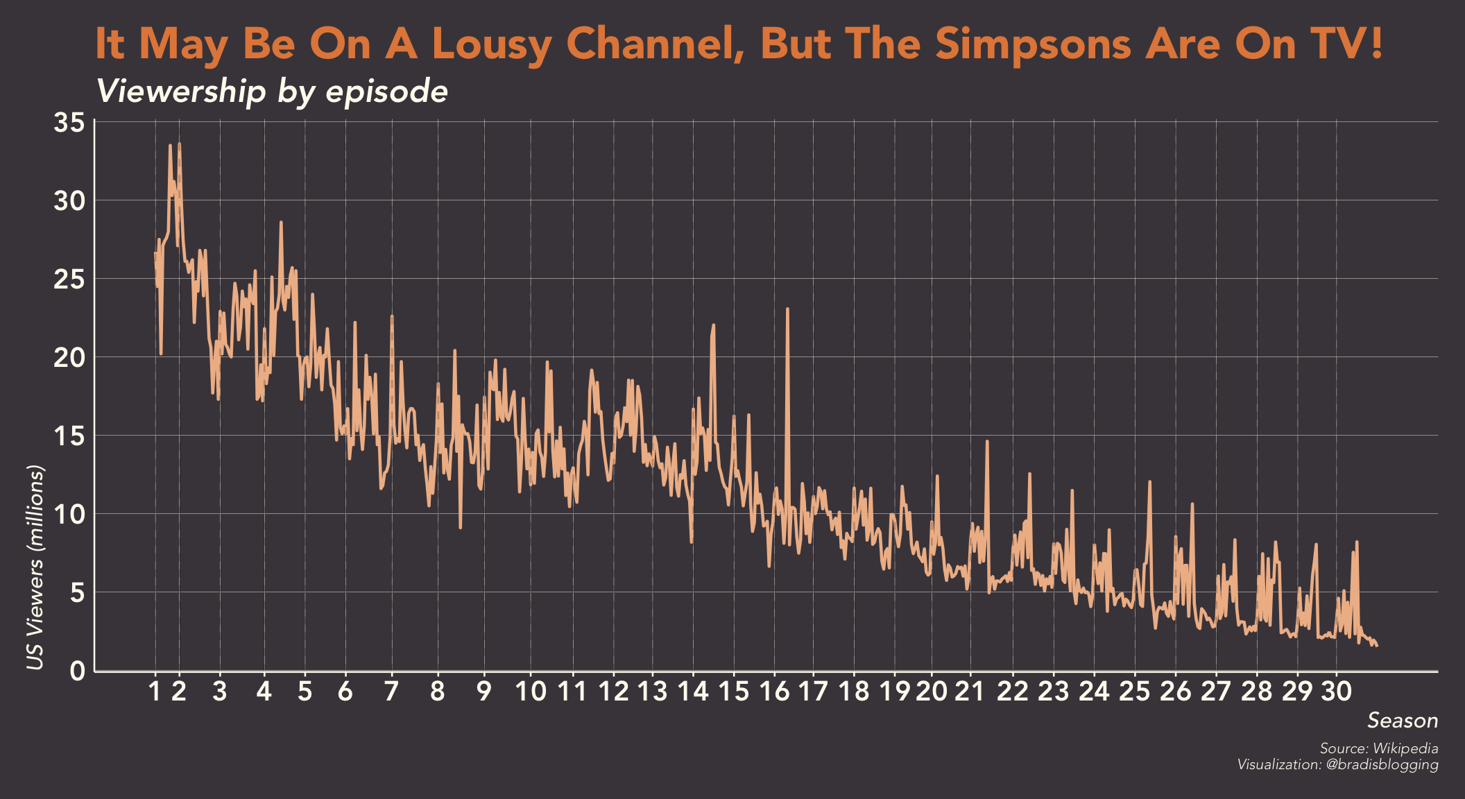 Well, that’s sad to see. Granted, the show has been on for 30 years. It’s a wonder it’s still around, but at this point it could probably have 3 viewers a week and still make it on air. Plus, I’d imagine that The Simpsons is a victim of its own success. If The Simpsons wasn’t as successful as it was, Family Guy, American Dad, Bob’s Burgers, etc. wouldn’t even exist, much less be relatively successful. A surprising trend here is mid-season spikes in ratings, especially from season 21 to present day.