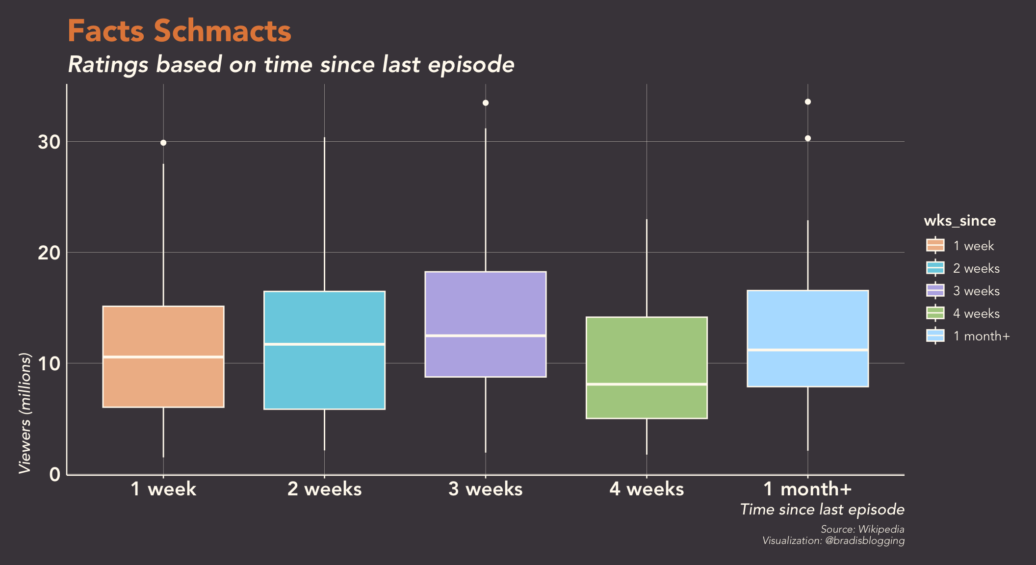 Chasing that down the rabbit hole, I found that 6 season highs were Treehouse of Horror episodes. Who knew that Simpsons fans were so enamored with Halloween? Or maybe they’re just enamored with holiday theme episodes. The problem with that idea is that there’s only one season high that aired in December.