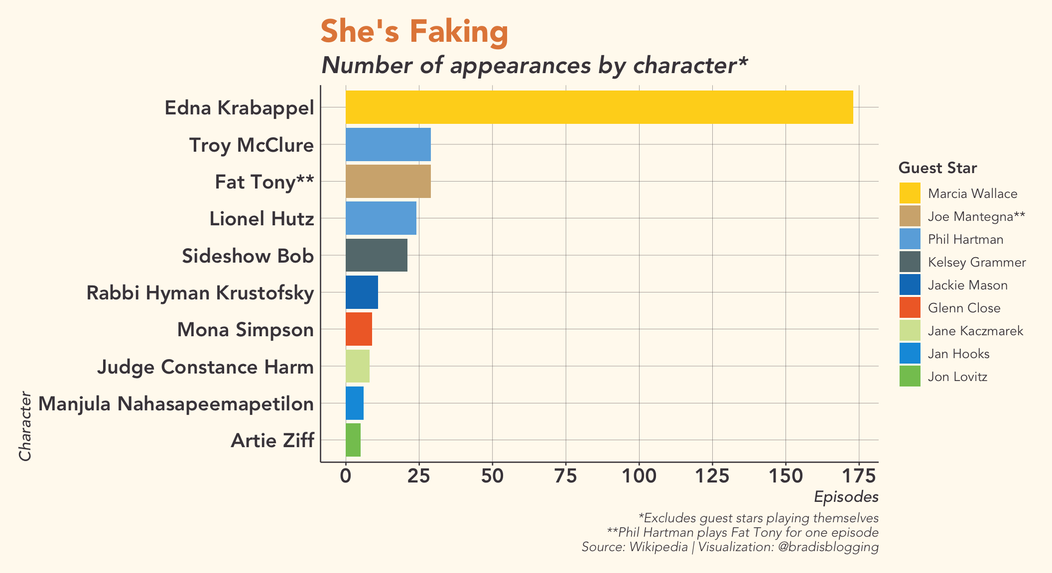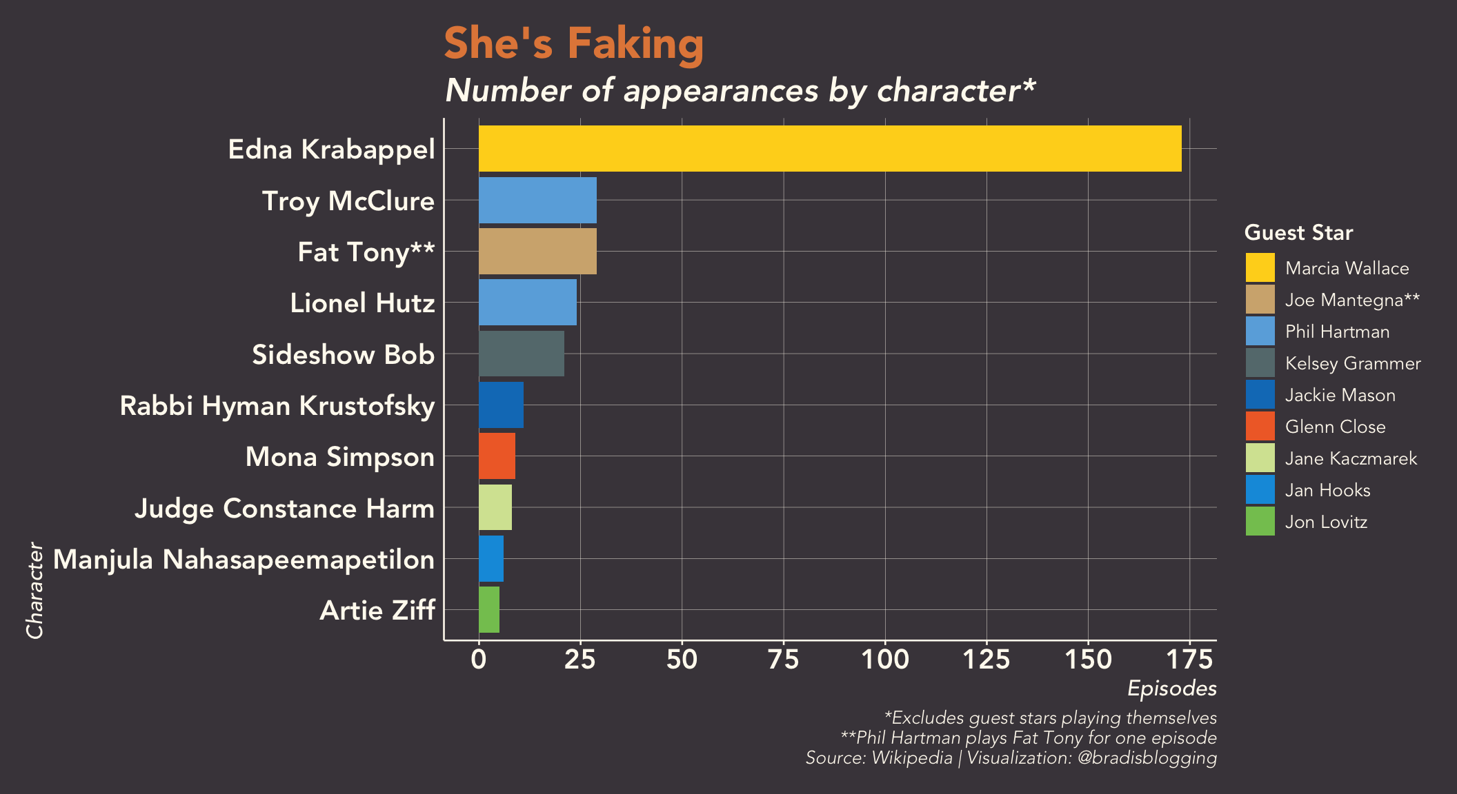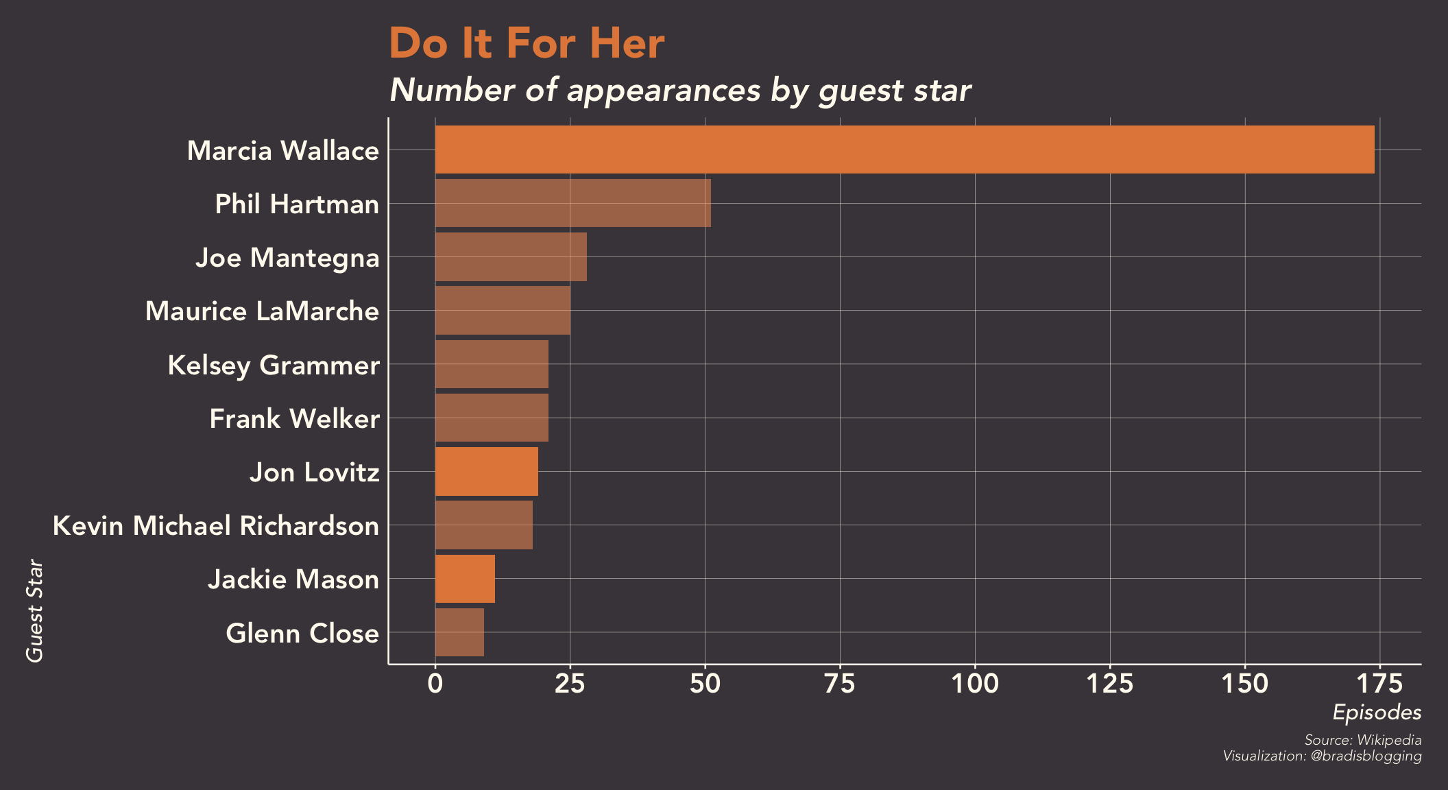 While Marcia Wallace is clearly a reoccuring guest star, Phil Hartman, who has been in the second most episodes, didn’t even make it in the top 25 for longevity. Jon Lovitz and Jackie Mason, on the other hand, appear in 15 and 9 episodes respectively.