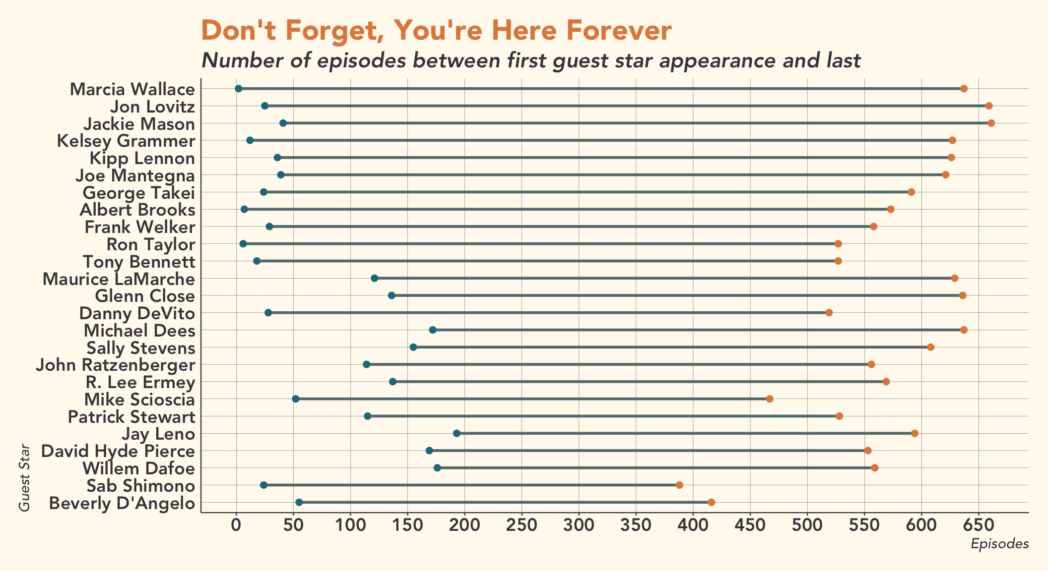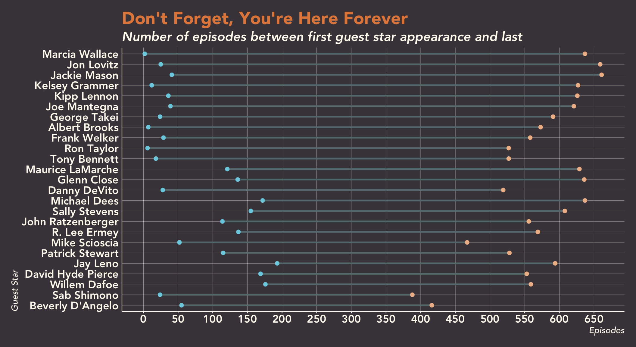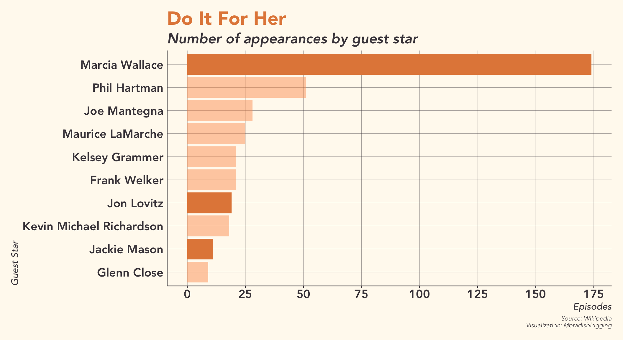 While Marcia Wallace is clearly a reoccuring guest star, Phil Hartman, who has been in the second most episodes, didn’t even make it in the top 25 for longevity. Jon Lovitz and Jackie Mason, on the other hand, appear in 15 and 9 episodes respectively.