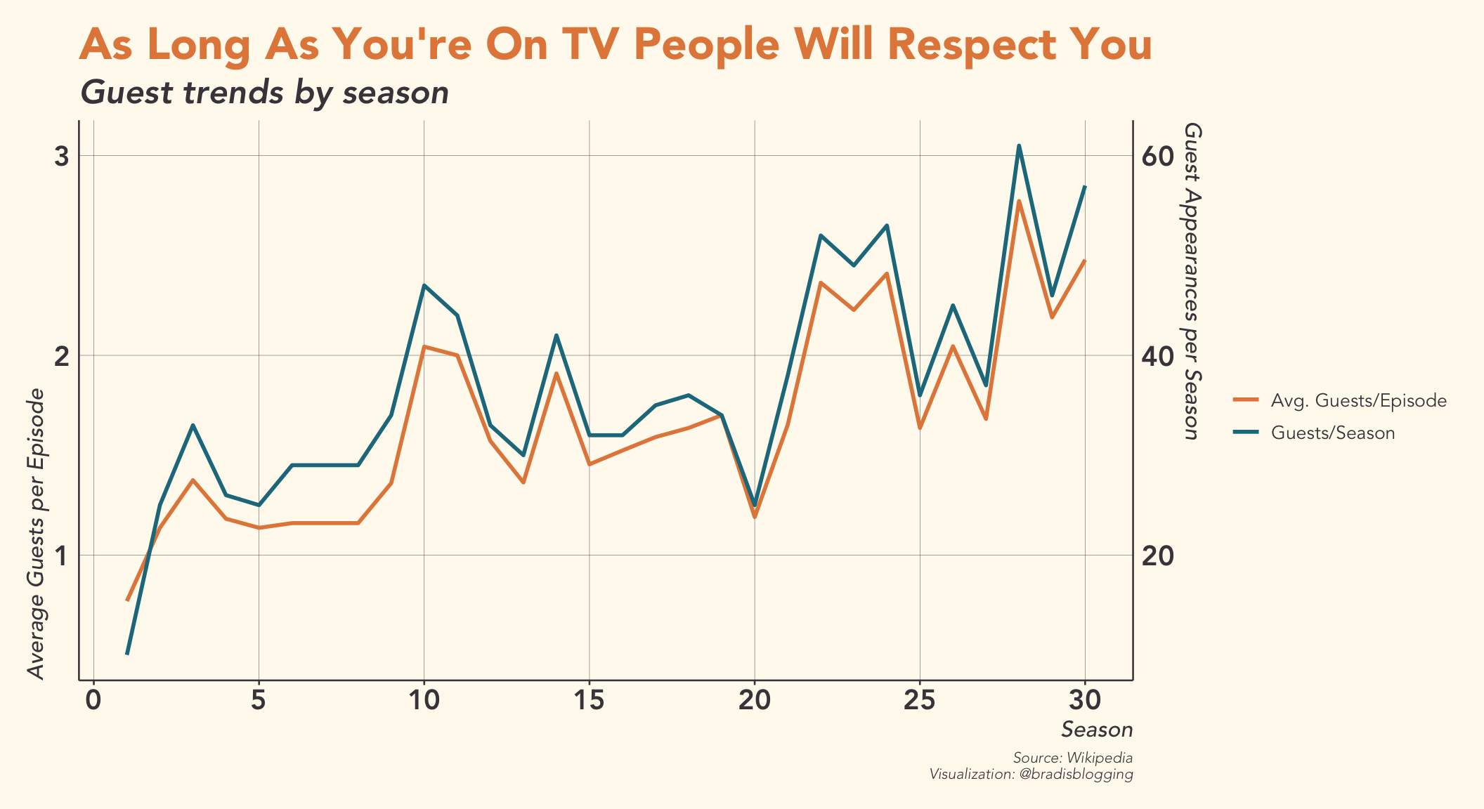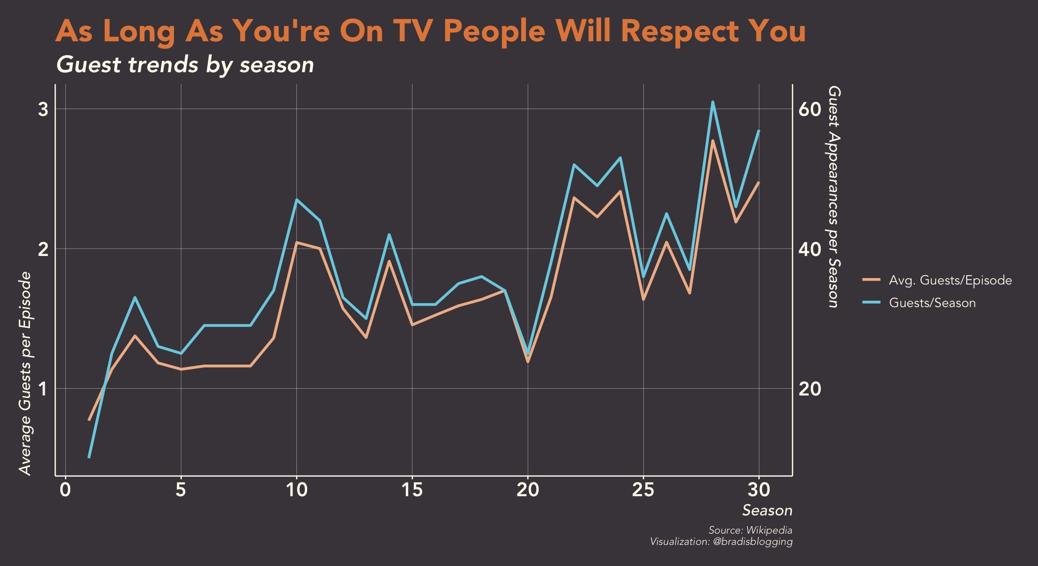 I noticed a lot of people on Twitter going the “number of guests per season” route, and I like that, but I wanted to also throw in an average guests per episode metric as well, because we have some seasons with fewer episodes than others (the first being the most obvious with only 13 episodes.) As the chart above indicates, the trend is still the same, and they track together, but it does show that the change is not nearly as drastic as it looks in the first few seasons. Also worth noting, I had to go grab the number of episodes per season from Wikipedia, because the final episode number would not appear in our data if there was no guest appearance. That did give me another idea, though. Why not get even more season and episode information from Wikipedia so we can take a quick look at rankings before I wrap this up?